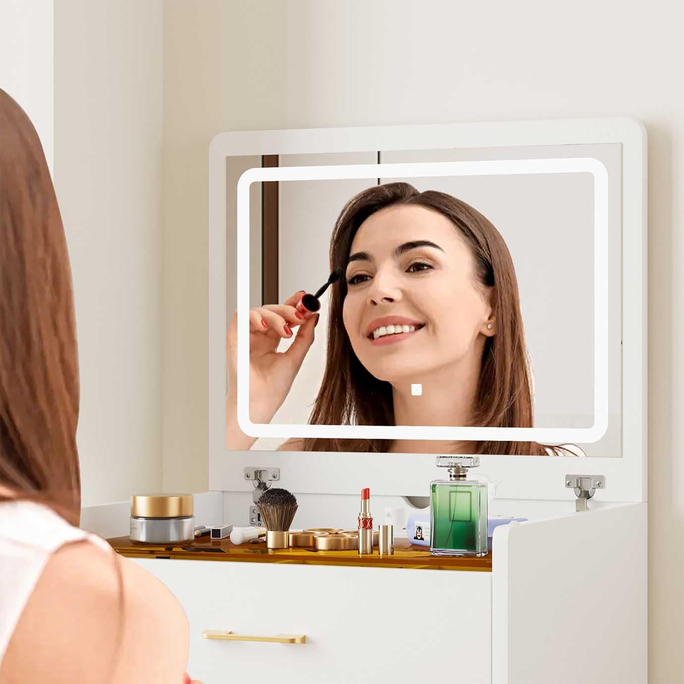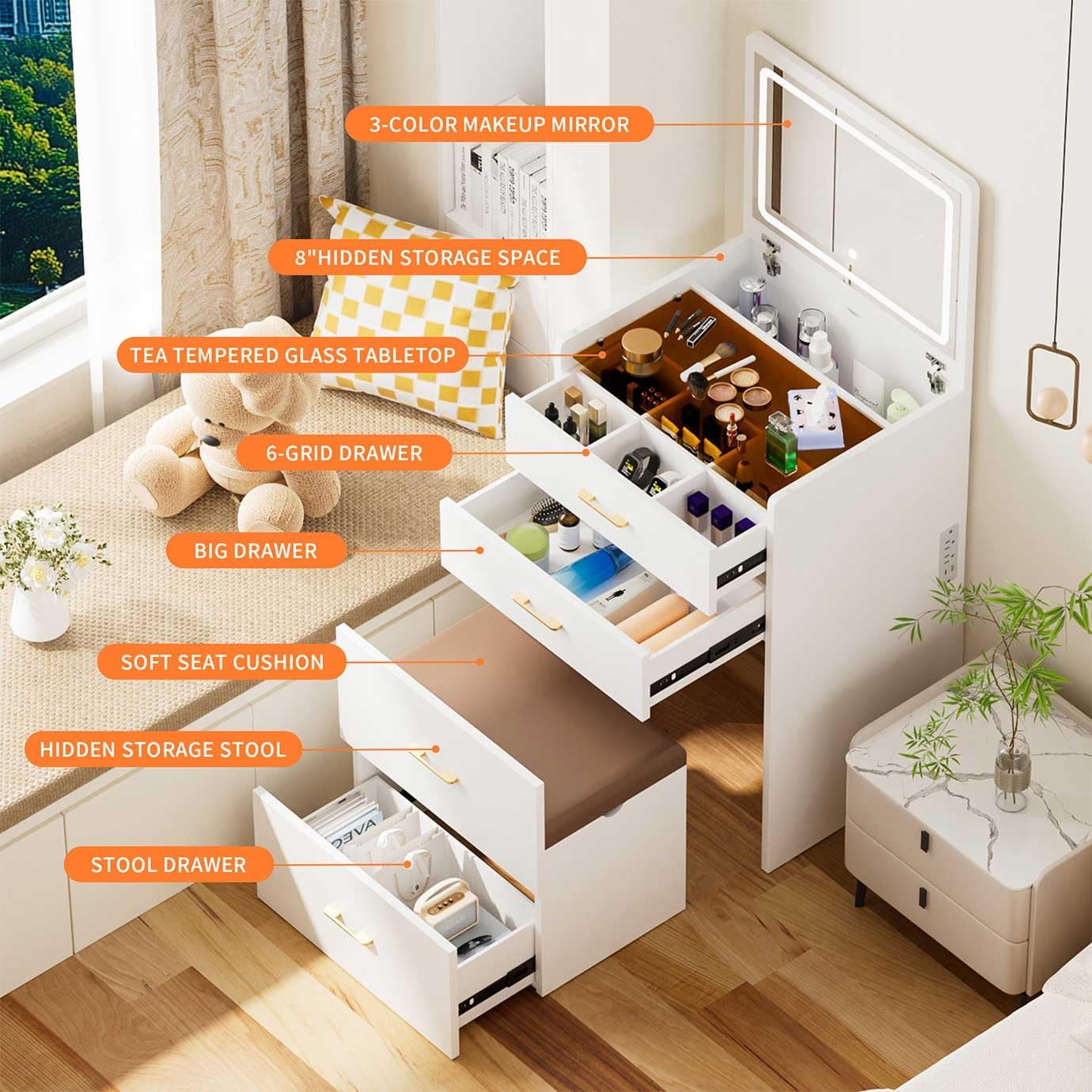 Product Dimensions & Specifications: Main Color: White Main Material: MDF + Tempered Glass Filler: Upholstered Stool with Hidden Storage Style: Contemporary, Luxury, Ultra-Modern Storage Type: 4 Extra Deep Drawers Flip-Top Tray Storage Assembled Dimensions: Length: 23.60" Width: 15.70" Height: 49.00" Weight: 72.00 lbs What's Included: 1 x Vanity Table Mirror 1 Storage Stool 1 Built-In Charging Station (2 AC, 1 USB, Type-C) All Hardware Easy-to-Follow Assembly Instructions This elegant, multi-functional vanity set is the perfect combination of luxury style and smart storage, designed to transform your daily routine in even most compact spaces.