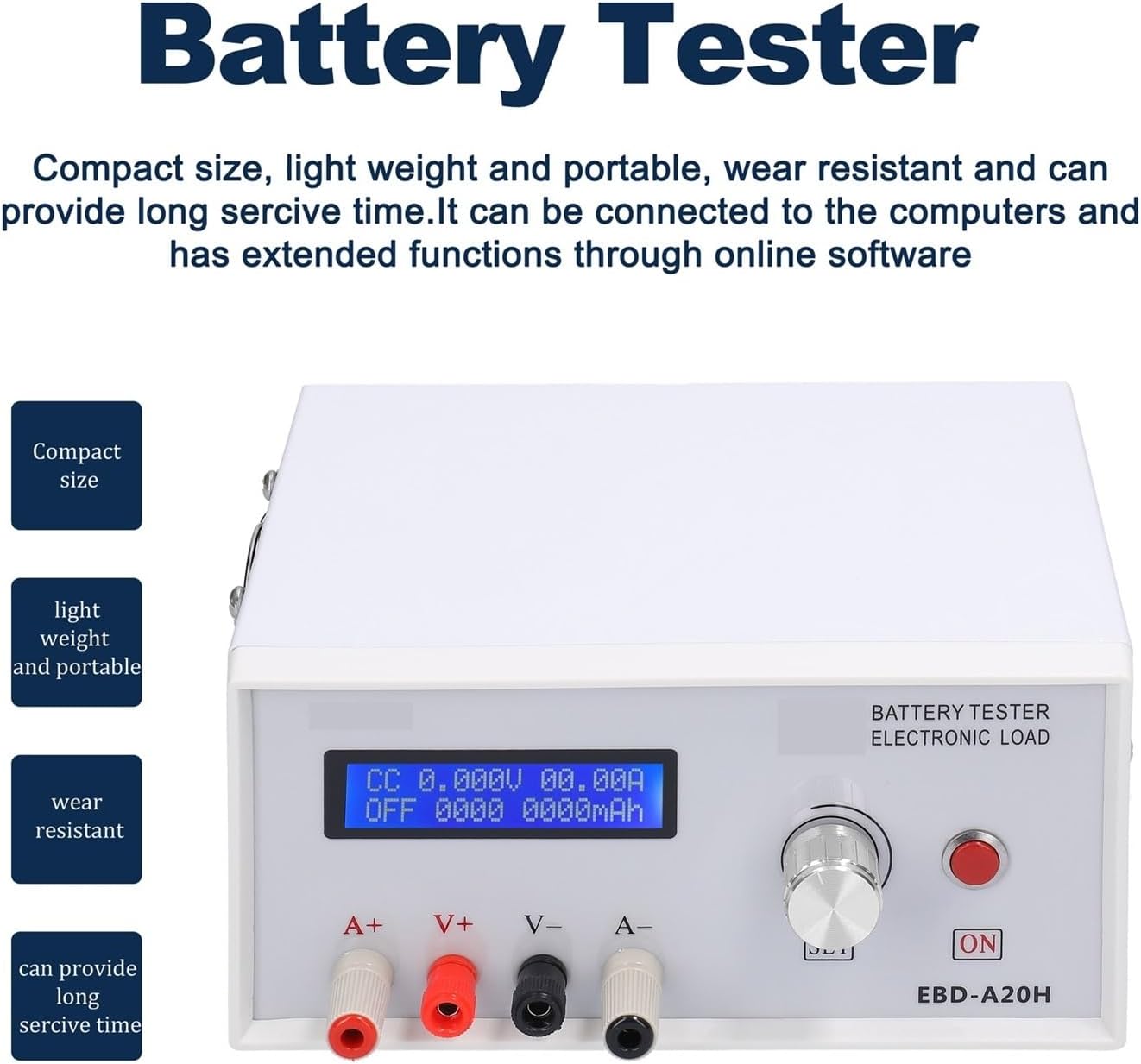 3 working modes can be set, you can set DSC-CC, DSC-CP according to your needs.20A discharge, the maximum discharge power is 200W.Support microcomputer online control, curve drawing, calibration and benchmarking, firmware upgrade, cyclic discharge, etc.Specification:Name: Battery TesterModel: EBD-A20HMaterial: aluminum alloyCurrent setting: discharge: 0.10-20.00A minimum step 0.01A (automatically limit the current when the power exceeds the limit)Mode setting: DSC-CC: constant discharge current, can be used to test battery capacity or supply currentDSC-CP: Constant discharge power, can be used to simulate constant power equipment or test power supplyCurrent test: 0.10-20.00A, accuracy to 0.01A, error ±0.5%Capacity test: 10Ah, resolution 0.001Ah10Ah-100Ah, resolution 0.01AhAbove 100Ah, the resolution is 0.1AhDischarge power: maximum 200WConnection mode: four-wire detection, separate wiring for voltage test and current channel to ensure measurement accuracyLCD display: voltage, current, capacity, time, power, electric energy and other test dataComputer online: dedicated USB to TTL serial port (not ordinary USB cable) supports computer control, curve drawing, calibration and benchmarking, firmware upgrade, cycle discharge, etc.