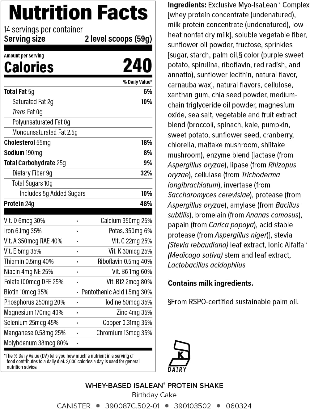 Focus on your health with Isagenix IsaLean Shake. This protein shake is not just any ordinary meal replacement protein powder. It's a superfood with 24 grams of high-quality protein sourced from grass-fed New Zealand dairy cows. The protein is undenatured, ensuring it retains its full nutritional value to support muscle growth and maintenance. Each serving has 8 grams of fiber and 6 grams of good fats.This protein powder is formulated with a superior amino acid profile, featuring branched-chain amino acids (BCAAs). A boost of these superior amino acids aids lean muscle growth and maintenance. To complement its impressive amino acid profile, this shake is fortified with 23 essential vitamins and plant-derived trace minerals. The shake also contains active enzymes to support digestion. This protein powder shake is free from artificial flavors, colors, or sweeteners.Isagenix formulates balanced and nutritious products so you can more easily prioritize healthy habits and well-balanced nutrition. With Isagenix, you have a sustainable system to support your health goals.